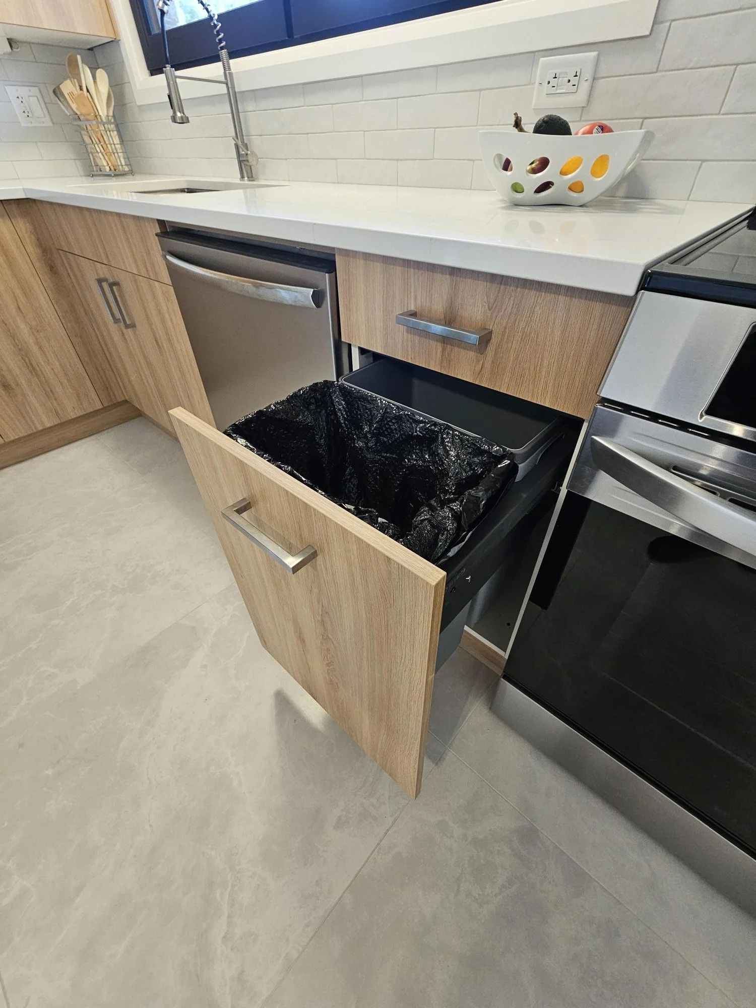 Hidden garbage and recycling drawers keep your space clean and clutter-free, while maximizing every inch of storage.